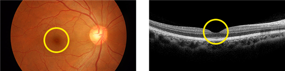 사람이 물체를 볼 때 상이 맺히는 카메라의 필름에 해당하는 부분이 망막입니다.황반(원 부분)은 망막의 중심부로서 중심시력을 담당하는 아주 섬세한 부분입니다.