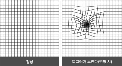 암슬러 격자 검사를 통해 집에서 자가 진단을 해볼수도 있습니다.