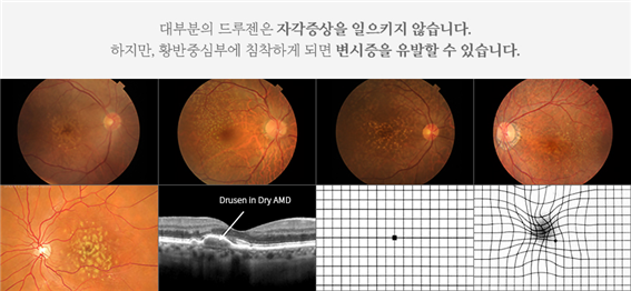 황반에 노폐물(드루젠, drusen)이 침착되거나 황반 세포들이 위축됩니다.