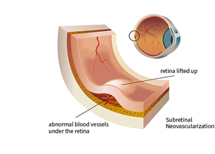 비정상적 신생혈관(맥락막 신생혈관)이 황반부에 자라 들어가는 형태입니다.맥락막 신생혈관 (choroidal neovascularization)은 출혈을 일으키거나(망막출혈), 혈관 내 성분들이 혈관 밖으로 새어나오기 쉽기 때문에(삼출물), 급격한 시력저하나 휘어 보이는 증상(변형 시, metamorphopsia)을 유발하게 됩니다.